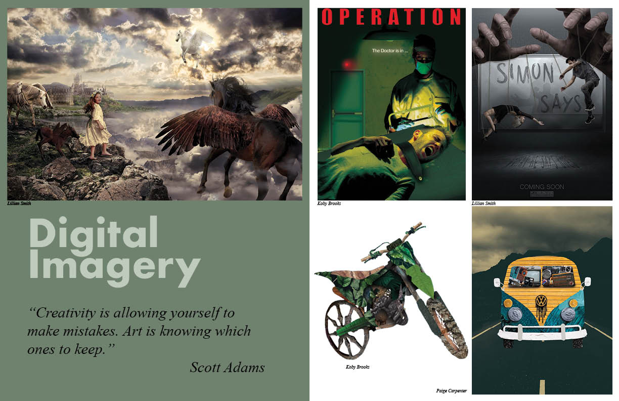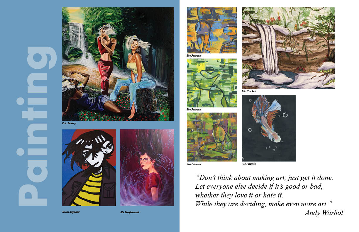 The first spread I completed was for painting. I was in charge of choosing the imagery from all sorts of submissions that we were given of different paintings. Some were photographed and some were scanned in. I was actually in charge of taking photos of all the imagery that could not be scanned for the whole magazine.