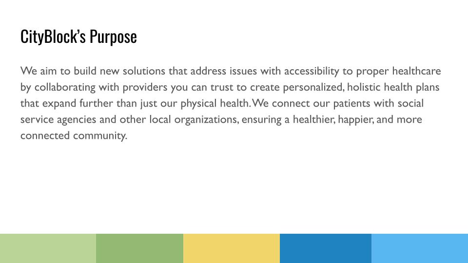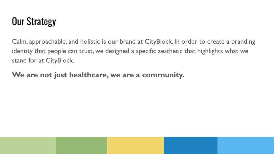 This was a group project where I worked with two of my classmates to create a branding for a health care brand that was assigned to us by our professor. Throughout the 8 weeks we talked to our professor and the teaching assistant as if they were the client that we were working for gathering any information we could to create an accurate brand for City Block.