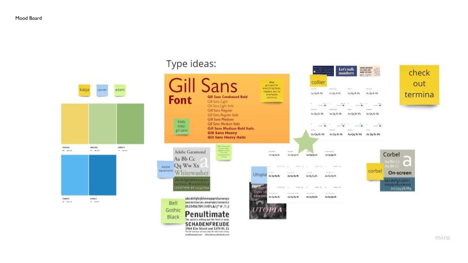 Our first part of the mood board started off by sharing the type choices and the color palette that we had chosen from the very beginning.