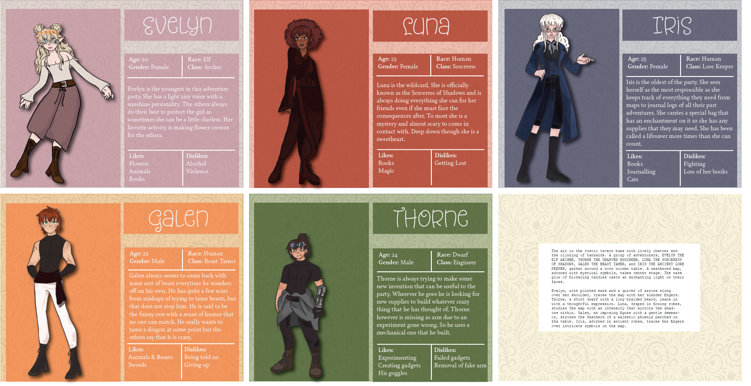 The characters themselves somewhat differ from the script as I took some creative liberties when I was drawing them out. Some changes are little things like the clothes they wore and removing the beard from the dwarf.