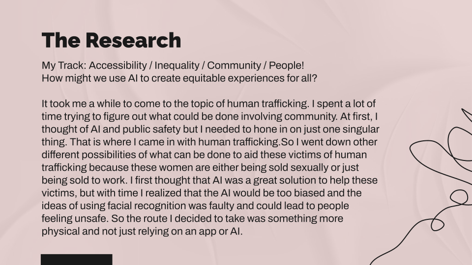 Here I explain more of my thought process when it came to my research and working within my track and coming to my decision of human trafficking as my research. Working in the community track was difficult for me at first as I did not know what I should be researching at the very beginning.