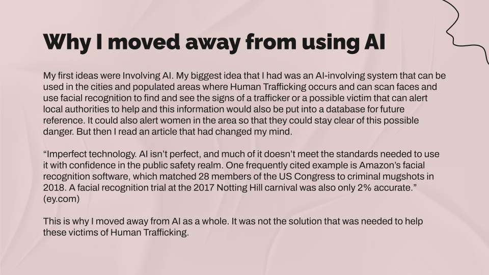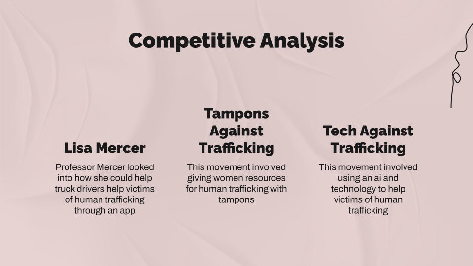 Competitive analysis was essential for my project. So I researched what other research and movements that exist in the realms of human trafficking and aiding the victims.