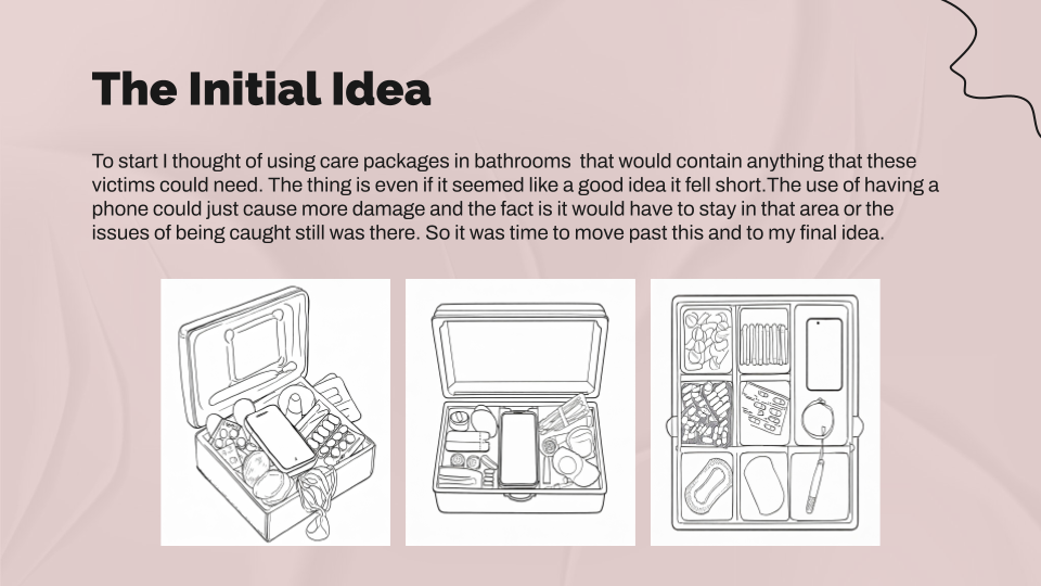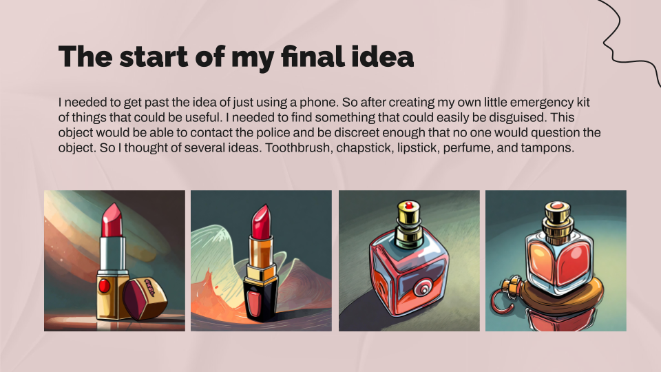 The slide to the left talks more in depth of what I was working towards, but essentially I wanted to create a device that one could used secretly so they could have help from the police.