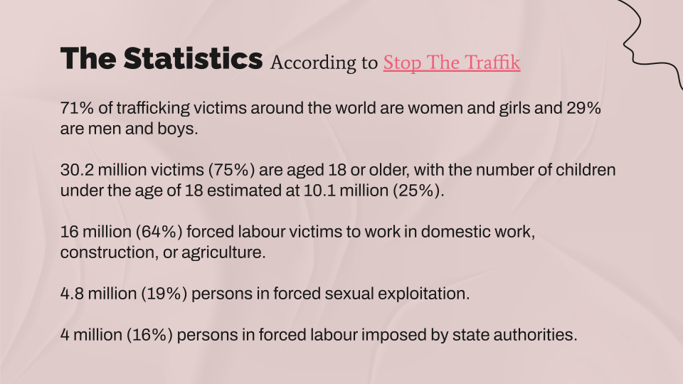 One of the first things I looked at when deciding that I am going down the route of human trafficking was the statistics. This helped me figure out how to narrow down my audiences age for research purposes and it helped me figure out what I should do to aid the victims of human trafficking.